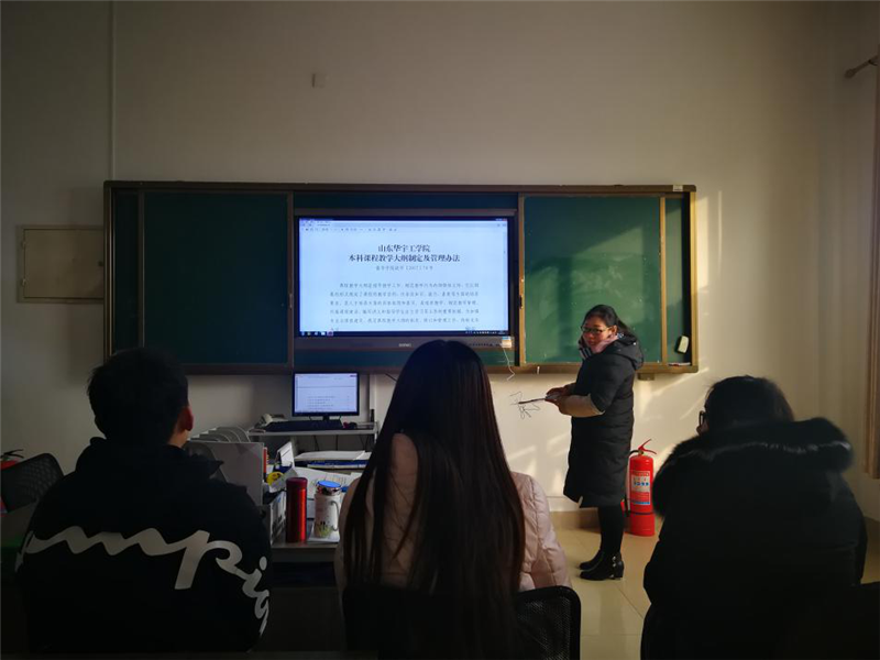 为了高效、有序地开展新学期教育教学工作,2月22日下午物理教研室主任解振平带领教研室全体教师,共同学习了《山东华宇工学院人才培养方案管理规定》、 《山东华宇工学院本科课程教学大纲制定及管理办法》、 《山东华宇工学院课程授课计划编制及管理规定》、 《山东华宇工学院教案编写的基本要求》, 《山东华宇工学院集体备课制度》等相关文件。
