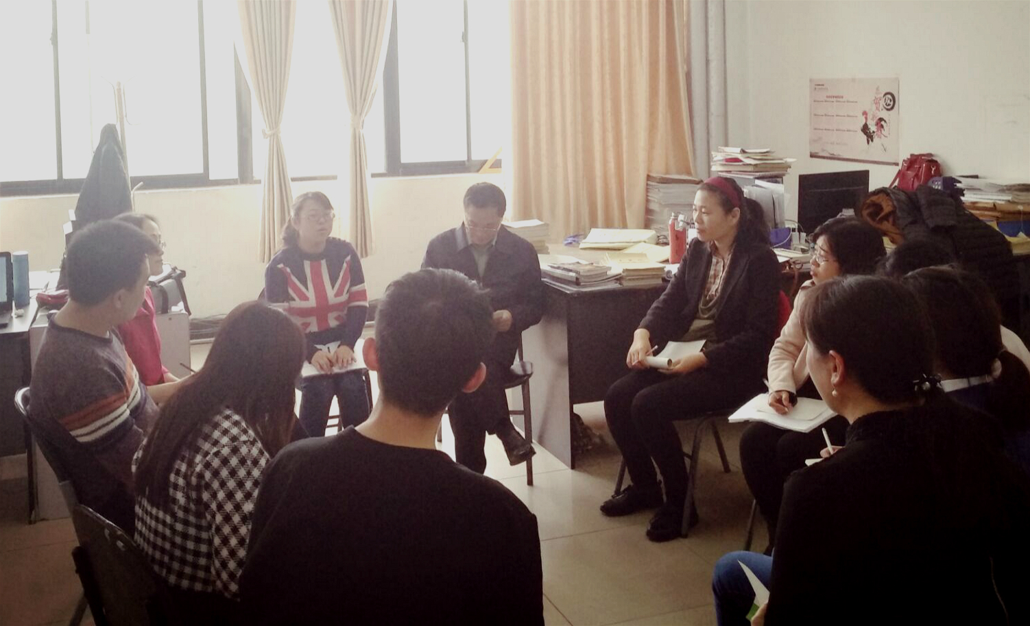 座谈会上,闫主任首先结合开学初情况,总结了本学期开学以来各层次的教学工作。各任课教师逐一积极发言,谈谈自己任教班级的教学状况。本科组教学情况如下:教学进度与授课计划基本吻合;合班上课学生水平差异较大,课上教学节奏不好把握;部分学生存在玩手机的情况,课堂氛围总体较好。专科组教学情况为:教学进度基本正常;部分同学存在课上玩手机现象;学生总体学习态度不积极,不能及时预习与复习;课堂氛围不活跃。五高组教学情况为:教学进度与授课计划基本一致;存在上课吃饭及玩手机等情况;作业完成度较差。同时,各位老师也互相分享有效的课堂教学管理办法,如进一步推进课程教学改革,及时了解学生学习状况,并加强与学生的沟通交流,发挥好班委的带头作用等。