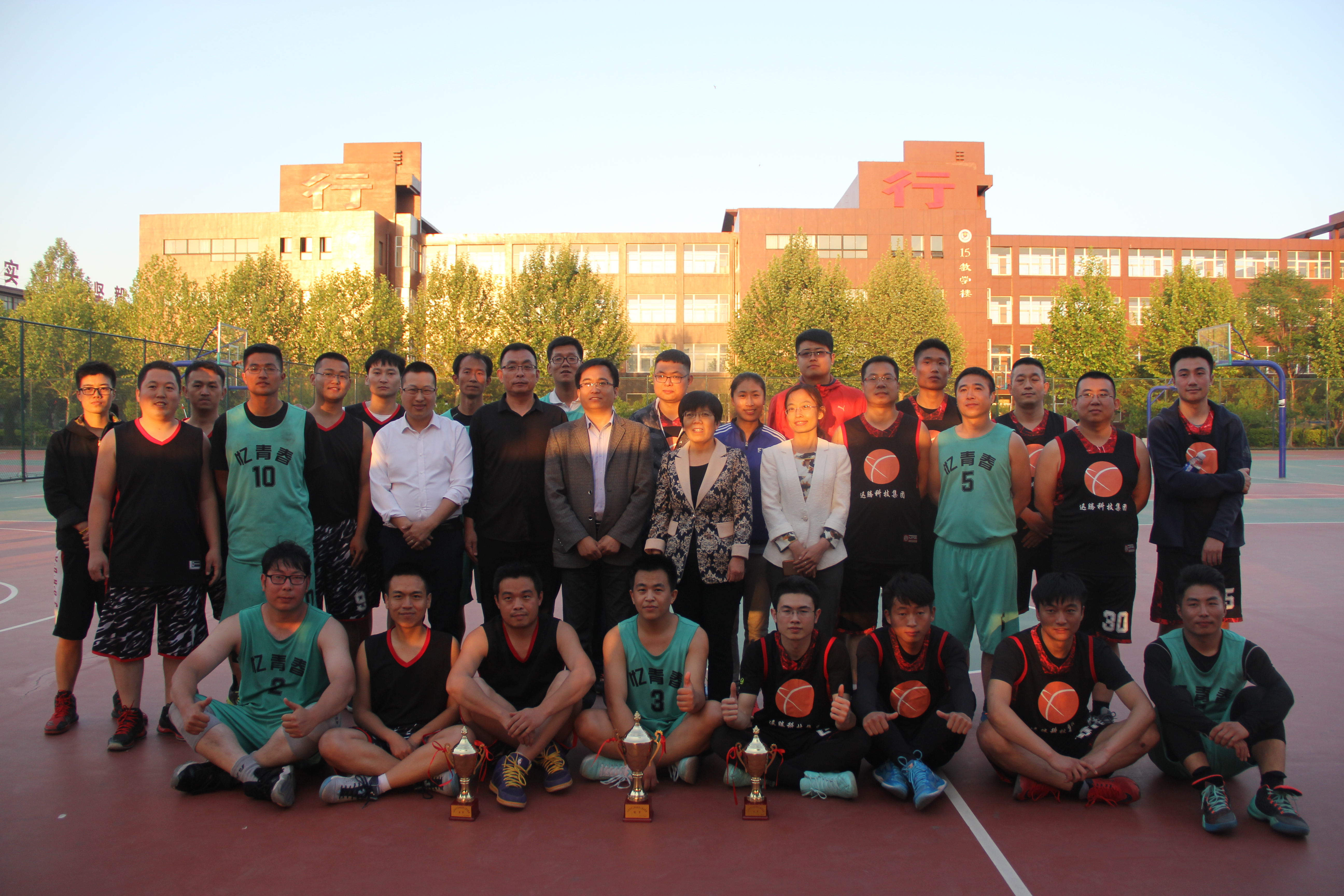 赛后举行了本届篮球赛的颁奖仪式,学校工会主席张帆同志为获奖队颁奖并合影留念。