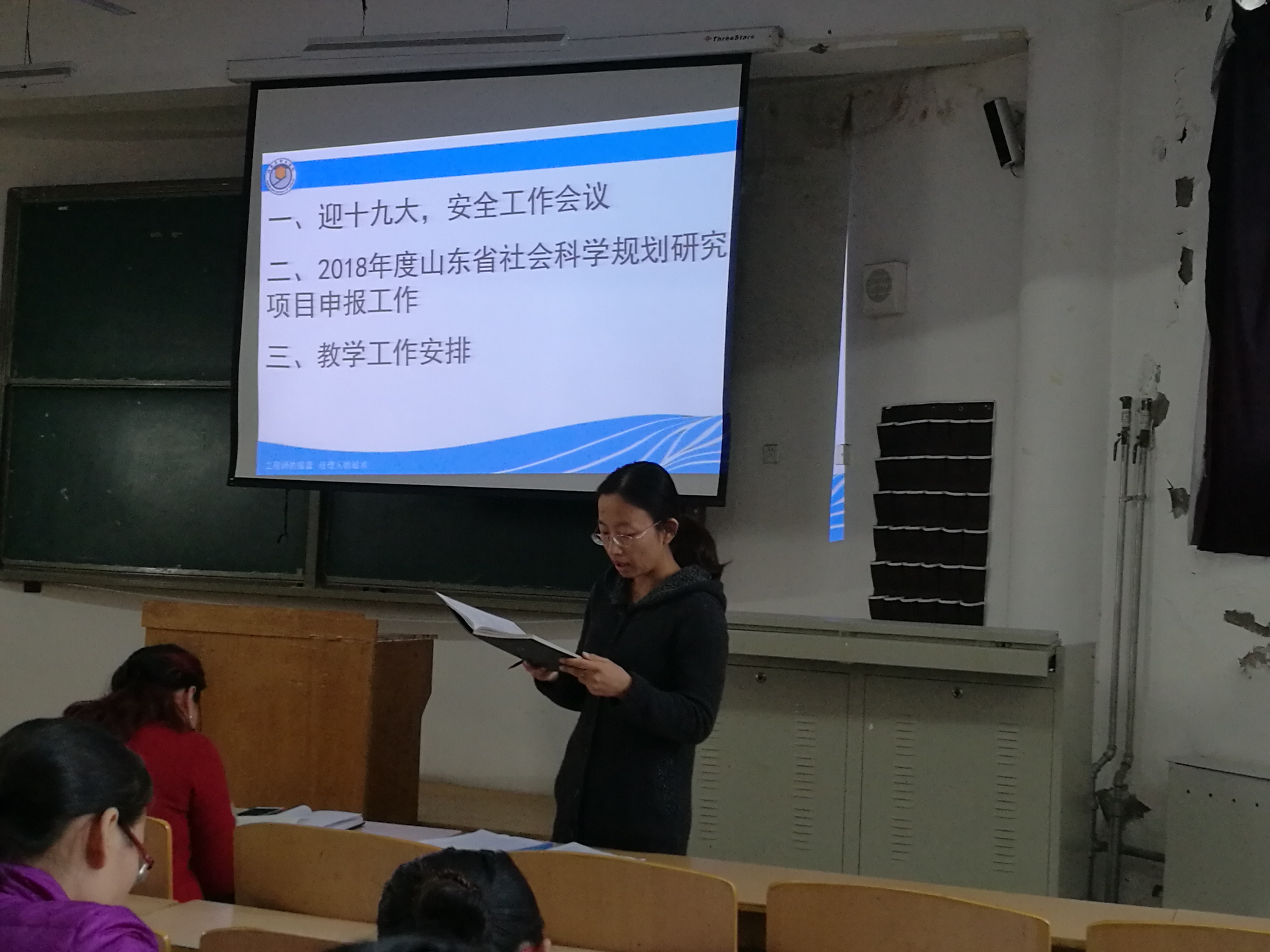 为贯彻落实《关于做好迎接中央党的十九大维稳安保工作集中督导检查准备工作的通知》,进一步做好我部安全稳定工作,10月13日下午四点,我部在10号楼F401召开迎接党的十九大安全稳定工作会议,会议由基础教学部副主任李琦主持,基础教学部全体教职工参加了会议。
