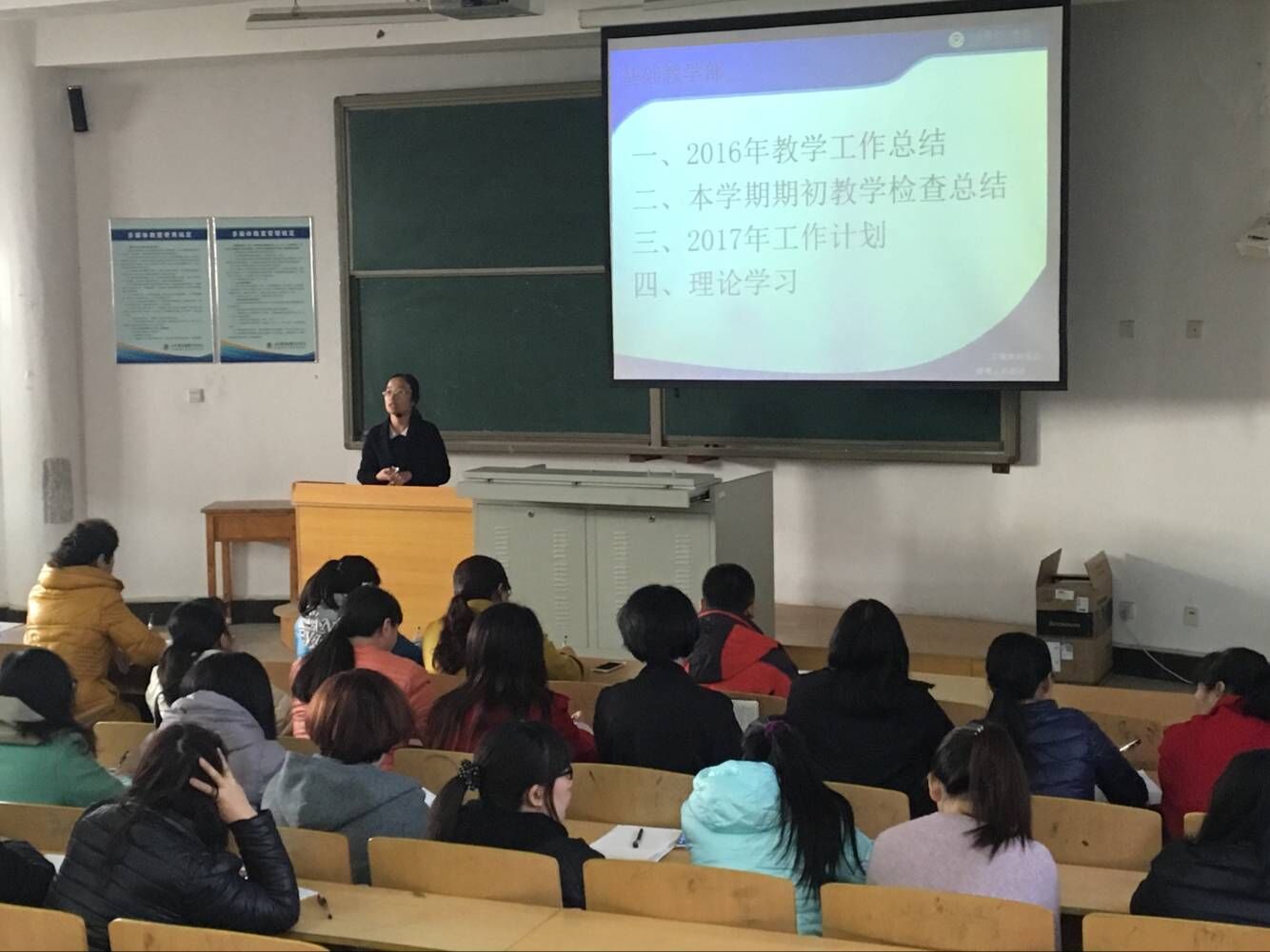 会上,李主任首先对我部2016年教学工作进行总结。肯定了基础部上学期取得的成绩,并对全体教师的付出表示感谢,同时指出了我部在上学期工作中的不足,并鼓励大家在新学期再接再厉,取得更好的成绩。随后,李主任对我部开课准备情况和教学运行情况进行了总结。强调指出了各教研室教学工作中存在的问题与不足,李主任明确指出期初教学检查是新学期起好步、开好头,迅速稳定开学阶段教学秩序的一项措施,也是实施教学管理及教学质量监控的重要步骤。最后,李主任布置了2017年基础部各项工作计划。内容涉及课程建设、教科研工作、教研室建设等。