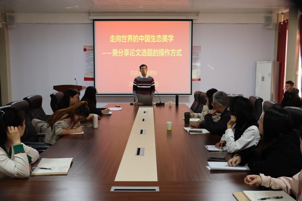 本次讲座分两个阶段。第一阶段,周思钊博士以《走向世界的中国生态美学——兼分享论文的选题操作方式》为题,以其发表的核心期刊学术论文写作实例,向大家分享了教师如何在课程教学实践中发现问题、形成研究,并进行学术创作。周博士的讲座内容涵盖了语教科研论题的选择、论题写作的基础框架与技巧、论文质量提升路径以及案例分析等多个方面,为教师们提供了宝贵的经验和指导。