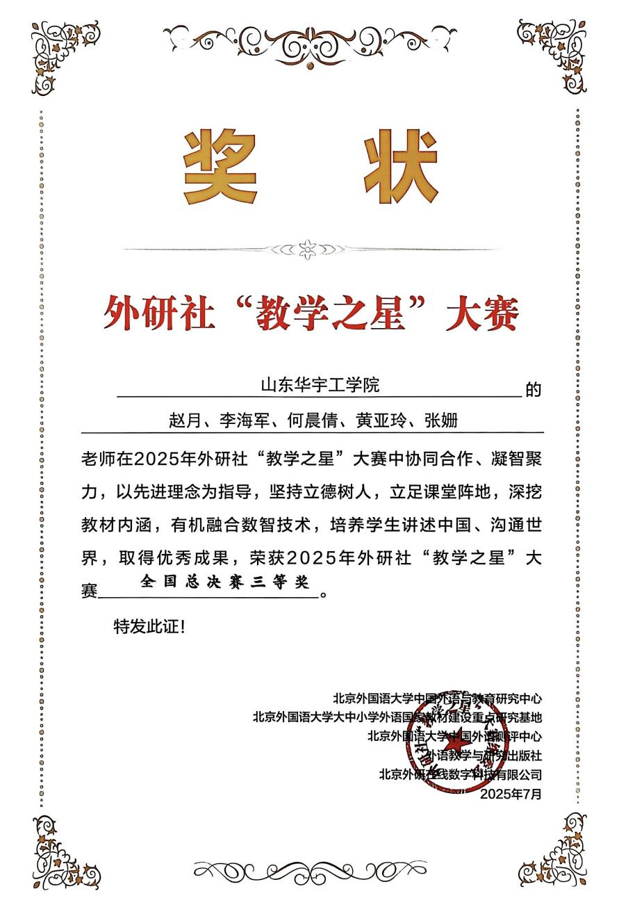 外研社“教学之星”大赛创办于2013年,是面向全国高校外语教师的大型公益赛事,在全国高校外语教育领域具有极高的权威性和广泛的影响力,被连续列入中国高等教育学会“全国普通高校教师教学发展指数”。本届大赛的主题为“外语教材的有效使用:讲述中国,沟通世界”,于今年4月启动,吸引了来自全国300余所高校的565组英语教师团队参赛。在全国半决赛中,威廉官网教师团队与来自南昌大学、河南大学等学校的团队同台竞技,赵月老师代表团队展示教学设计,李海军老师展示教学实践,运用先进理念,坚持立德树人,有机融合数智技术,得到评委的一致认可,最终荣获2025年外研社“教学之星”大赛全国总决赛三等奖。