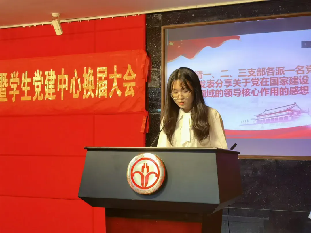 换届大会上,2023-2024学年学生党建中心常务副书记严宇恒代表即将卸任的学生干部进行任期汇报和工作总结,新任学生党建中心主任林金平和副主任吴佳儿同学发表就职演讲。吴佳儿同学表示,党建中心将继续发扬优良传统,为党和群众搭建桥梁,紧跟时代潮流开展工作创新;各部门要加强沟通联系,维持深度合作,汇聚党建力量;全体干部要带头开展理论学习,提升能力,不断提高思想政治素养,以实际行动践行使命担当。