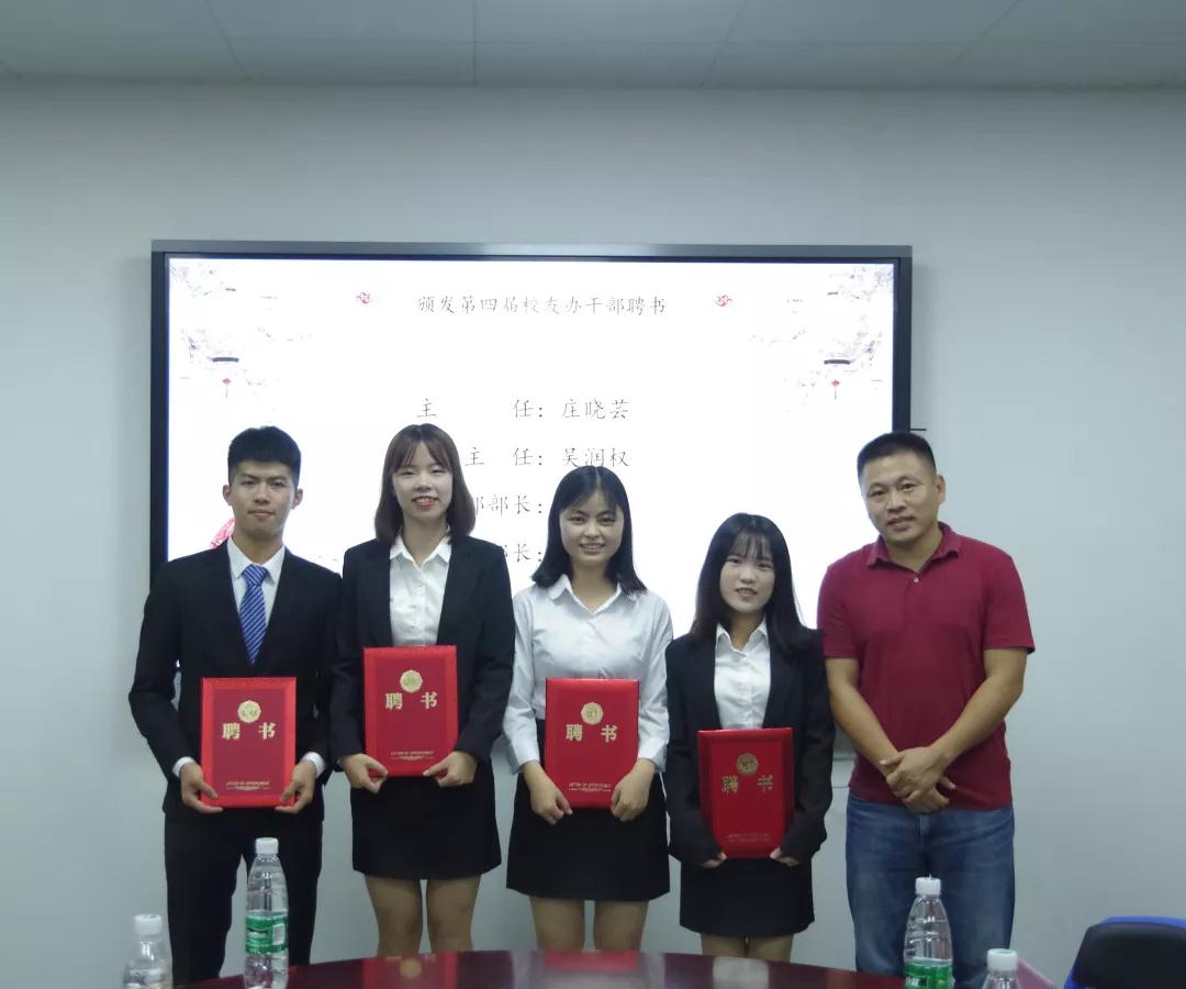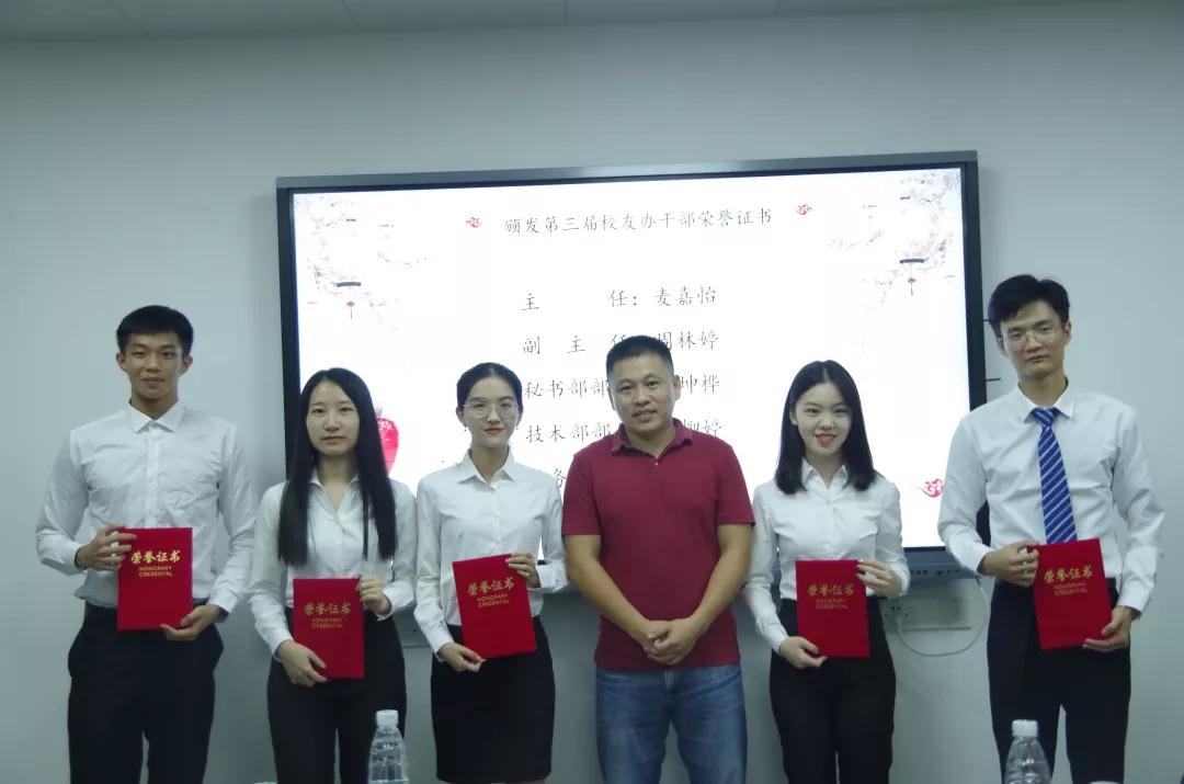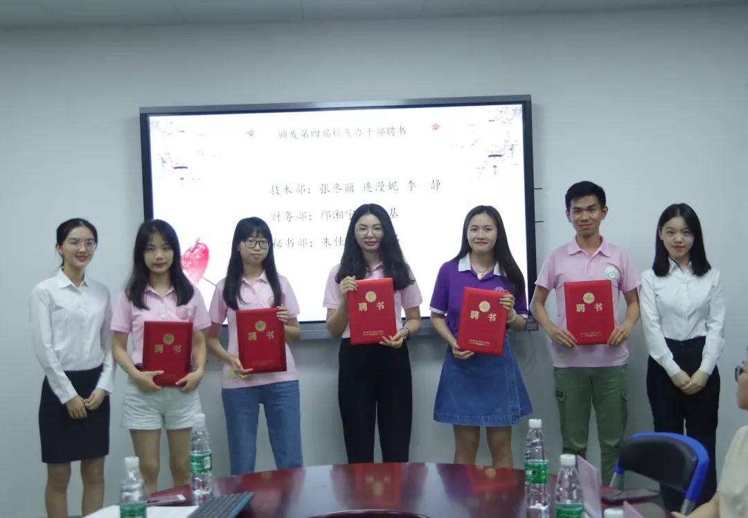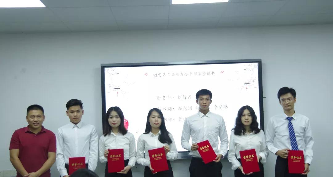 麦嘉怡主任汇报后,经贸学院校友办指导老师曾晓思首先为第三届校友办干部颁发荣誉证书,以表彰其过去一年来为校友办所作出的贡献。紧接着晓思老师为第四届校友办主任团及部长团颁发聘书并合影。接下来校友办主任麦嘉怡为17级技术部干事颁发聘书,副主任周林婷为17级财务部和秘书部干事颁发聘书。
